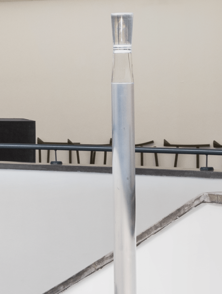 The first from a series of sculptures I’ve created for the exhibition “Don’t Say Water Water” at the Bat Yam Museum of Art. Lay one on top of the other two completely generic glasses. The lower is connected to an aluminum pipe at a height of 4.5 meters. The upper glass is filled with water to its limit—a statue that functions as a temple. The water, lying quietly on the edge of the glass, evaporates and must be filled daily, emphasizing the day-to-day worship required by the statue.