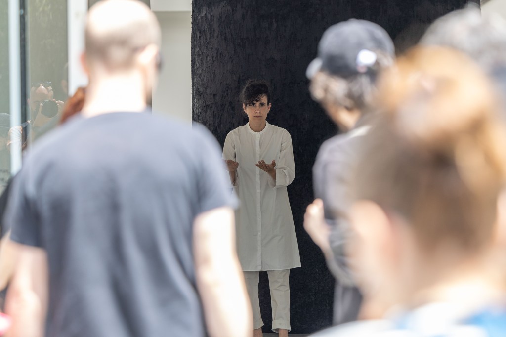 The ritual was a broad action with many layers. In its essence, it requested that the separate entities – the artist, museum, and audience, succeed in merging into each other as if immersed in shared water. This image captures the moment the audience flows into the museum and follows me to the ground floor. A ritual is an action with a collective interest, where transformation takes place. Throughout the ritual, I created images that transformed like a stream of consciousness in which water had many changing appearances on the continuum from water as a symbol of life to water as a symbol of horror.